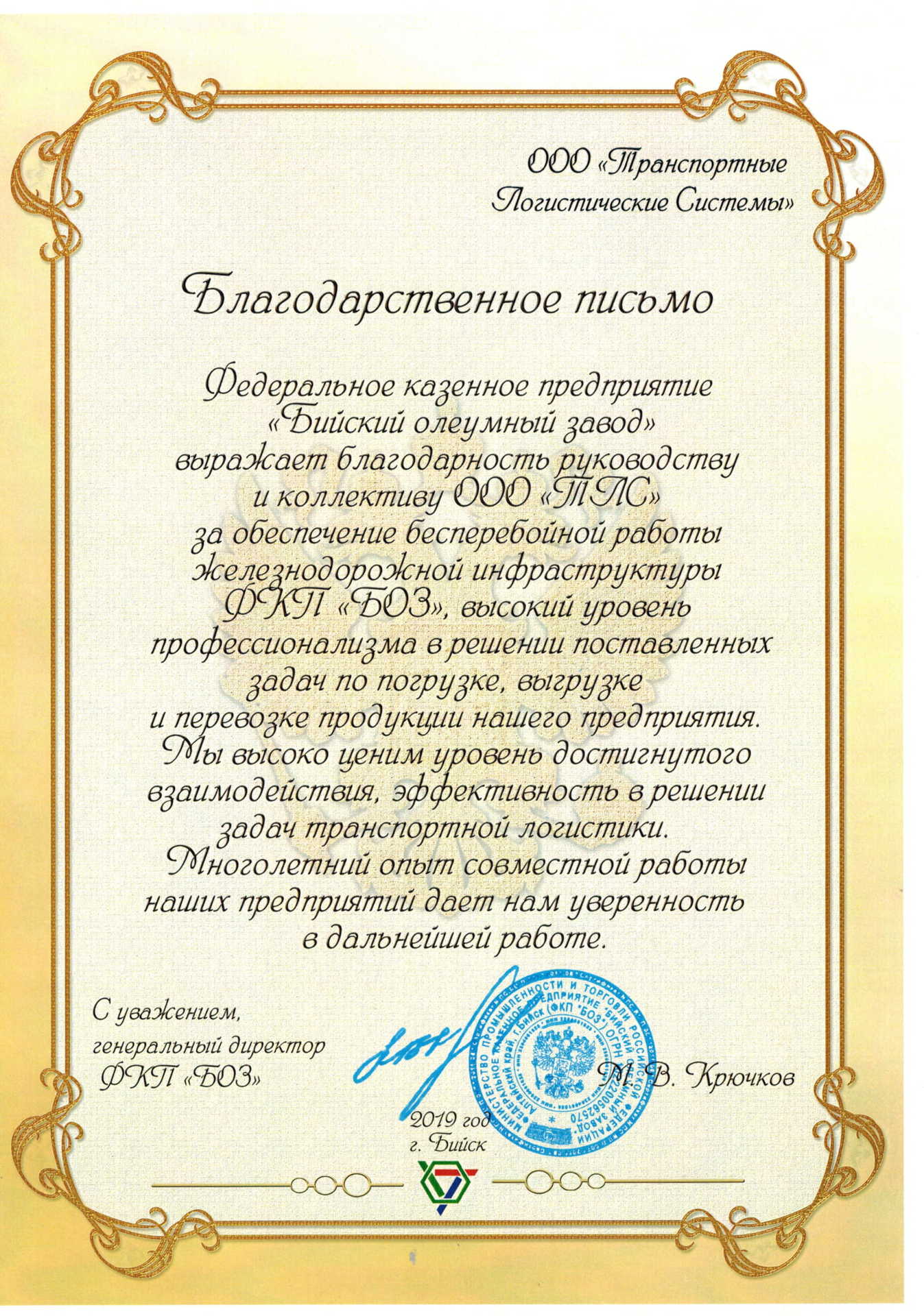 29 января службой Вагонного хозяйства (Западно-Сибирская дирекция инфраструктуры) на селекторном совещании подведены итоги работы в 2005 году по эффективности системы допуска на инфраструктуру ОАО "РЖД" вагонов после текущего отцепочного ремонта, а так же предупреждению эксплуатации нелегитимных деталей вагонов. Участок текущего отцепочного ремонта в г.Бийске, принадлежащий ООО "ТЛС", по показателю "коэффициент качества ремонта" занял лидирующее место среди 25 предприятий ЗСЖД. Из 88 отремонтированных вагонов в 2005 году не было допущено ни одного случая повторной отцепки вагонов по причинам не качественного ремонта или легитимности установленных деталей.